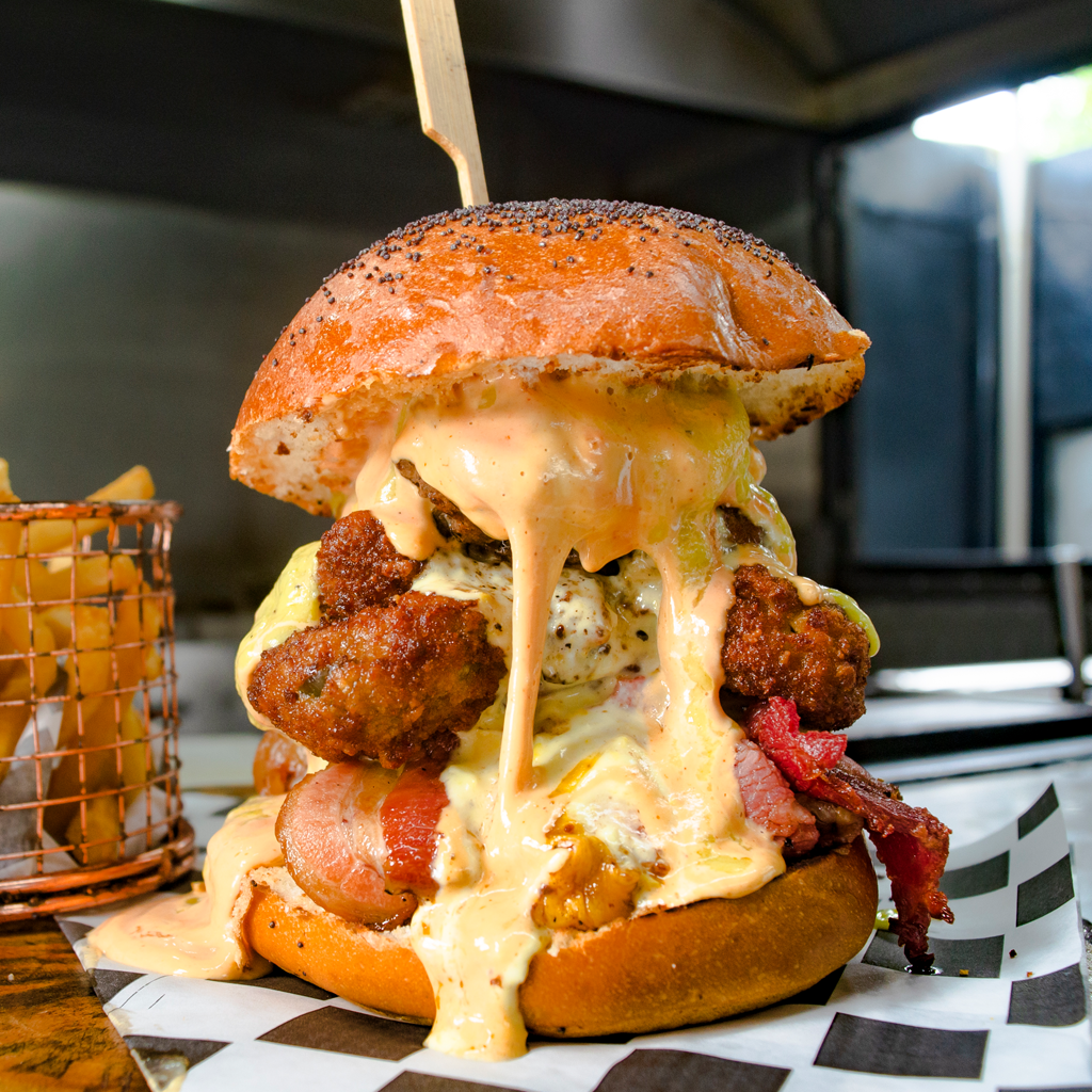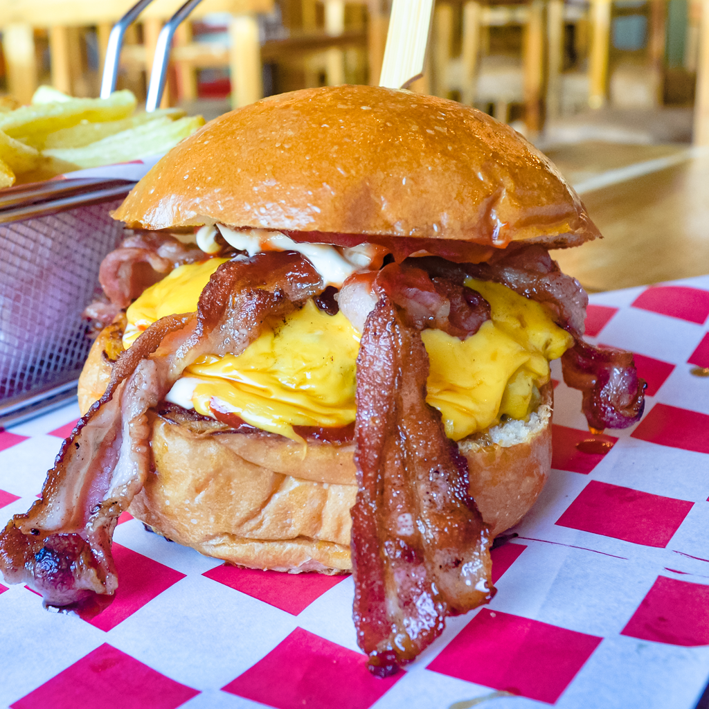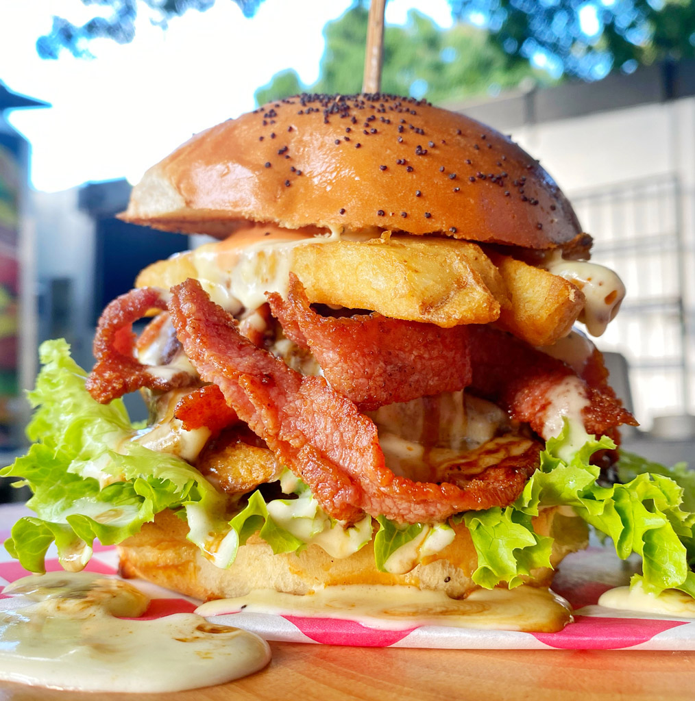 6 Oz de res premium, dos huevos fritos, papas rayadas fritas, salsa sweet corn y bacon caramelizado.