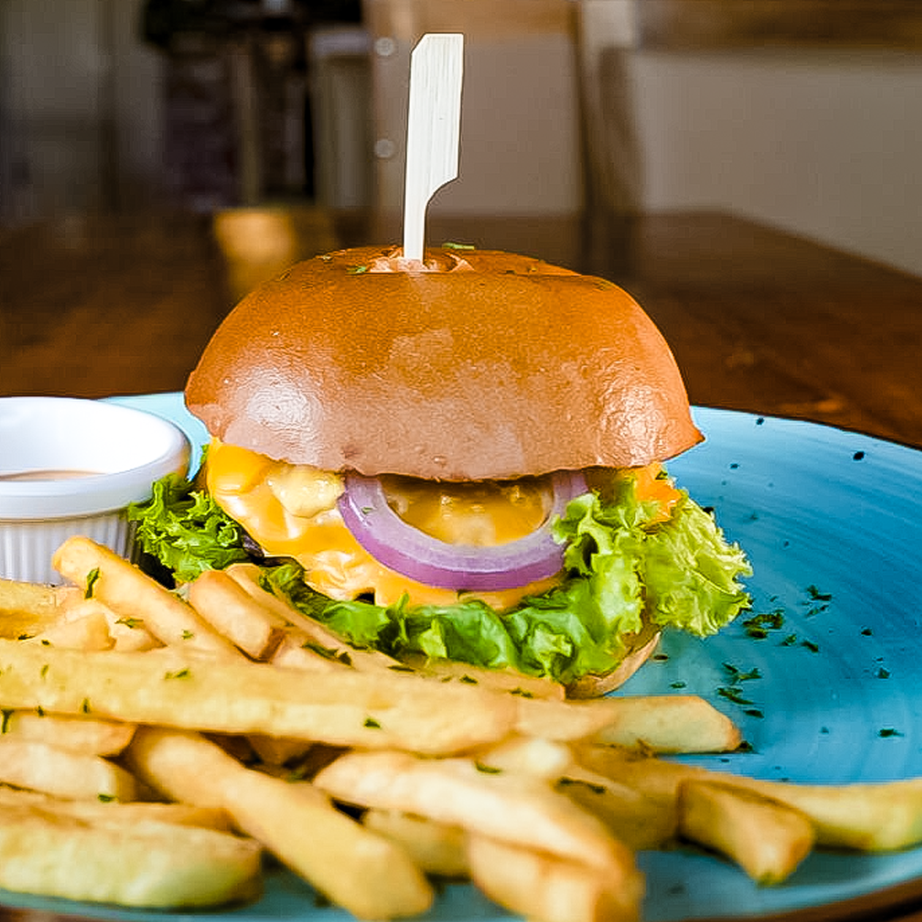 Jugosa Carne de Res Premium de 6 Oz, Mozzarella en Panko Frito, Repollo y delicioso Queso Fundido con papas fritas.