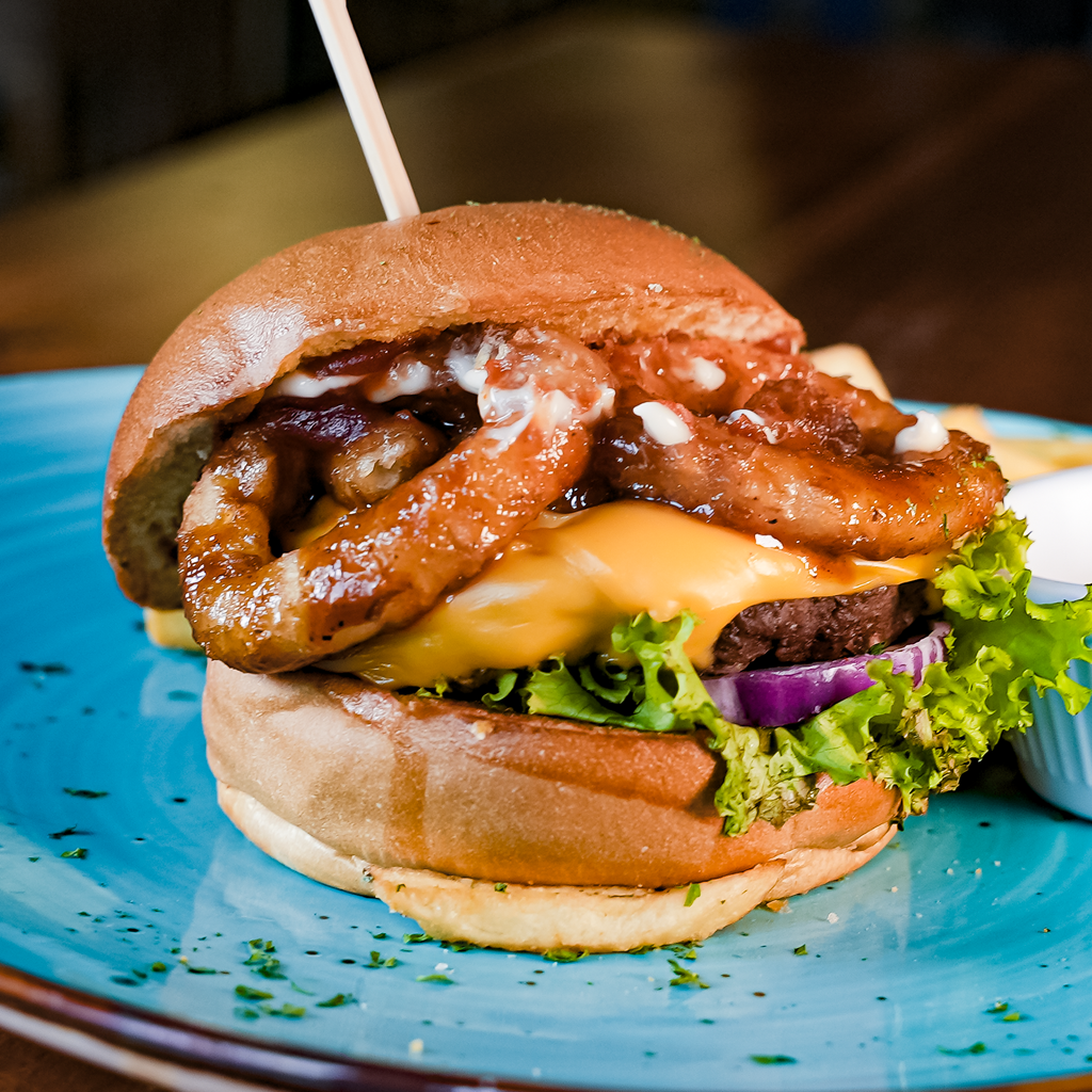 6 Oz de Res Premium, Aros de Cebolla, Queso Cheddar, Salsa BBQ y Salsa de Maíz.