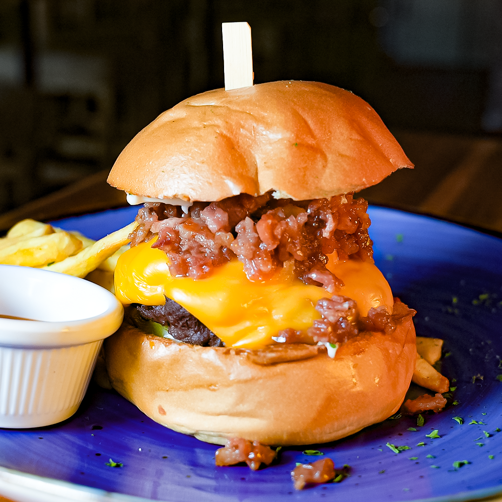 6 Oz de Res Premium, Bacon Caramelizado, Queso Cheddar, Cebolla y tomate.