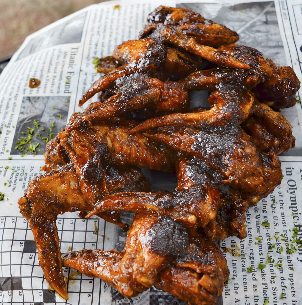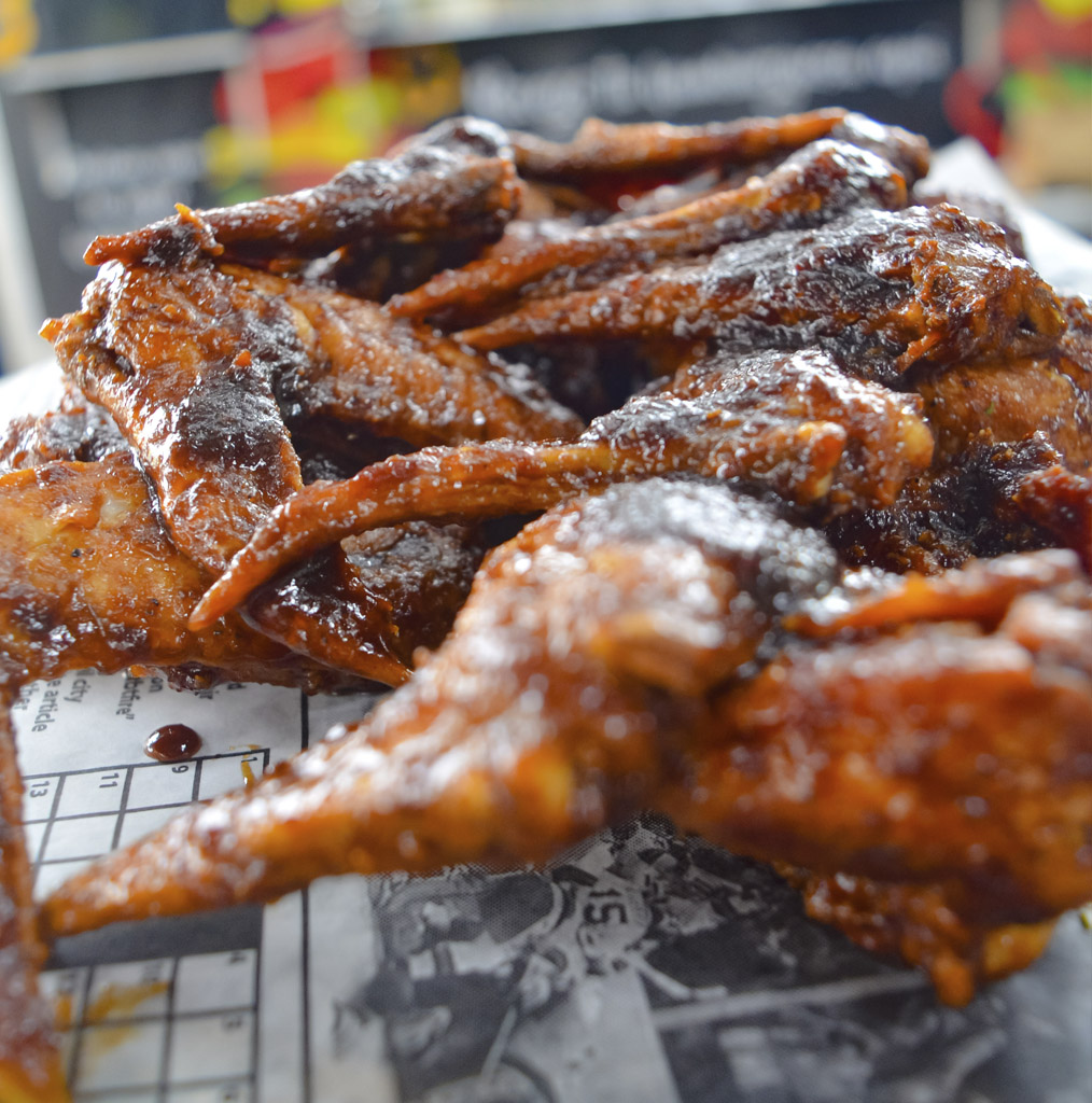 Alitas jugosas con Salsa BBQ de la casa y Papas Fritas.