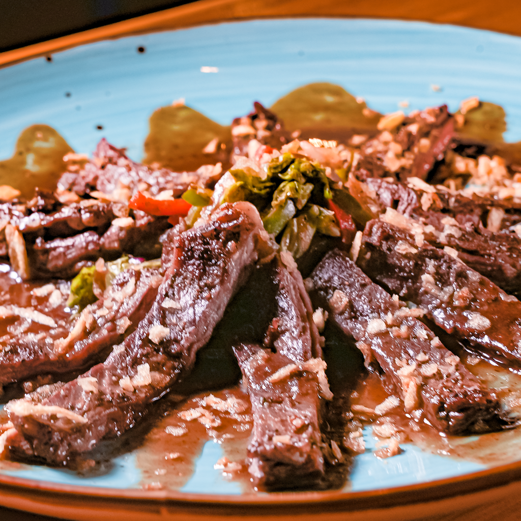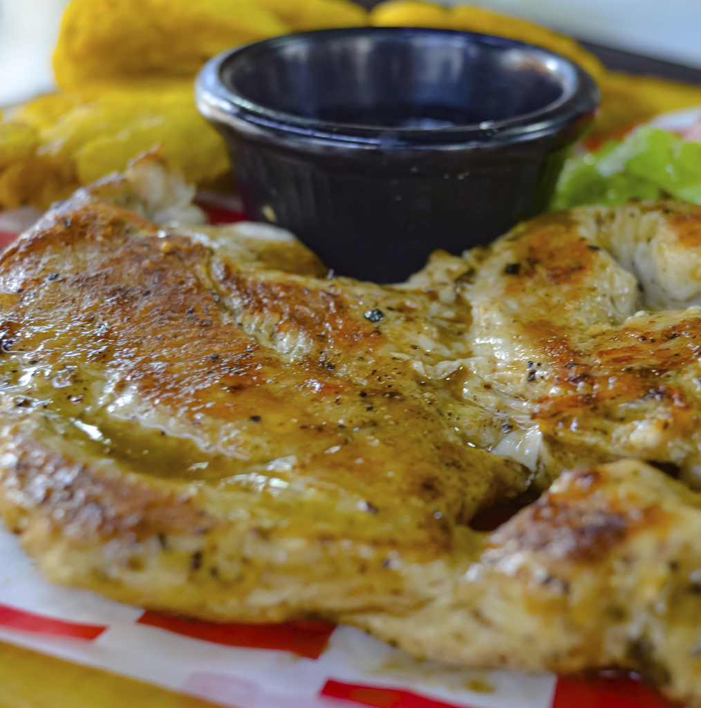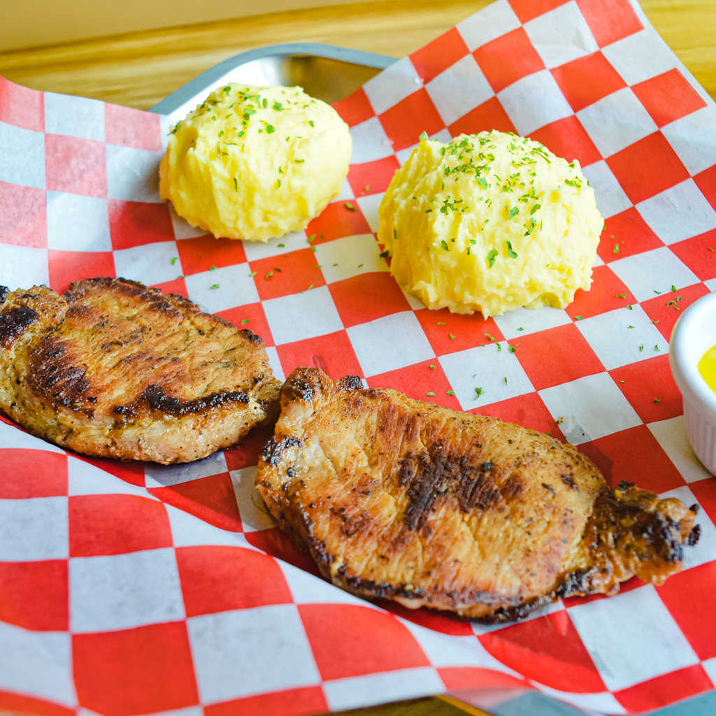 12 oz de lomo de cerdo con salsa chimichurri acompañado de tostones, puré de papa o papas fritas.