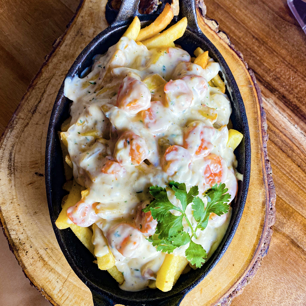 Papas fritas con camarones a la crema por encima y queso derretido.