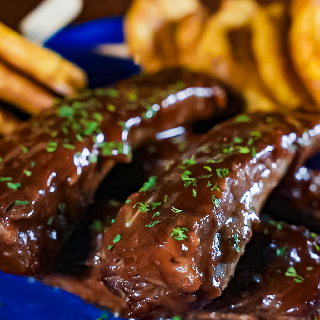 Costillitas con Salsa BBQ y papas fritas.